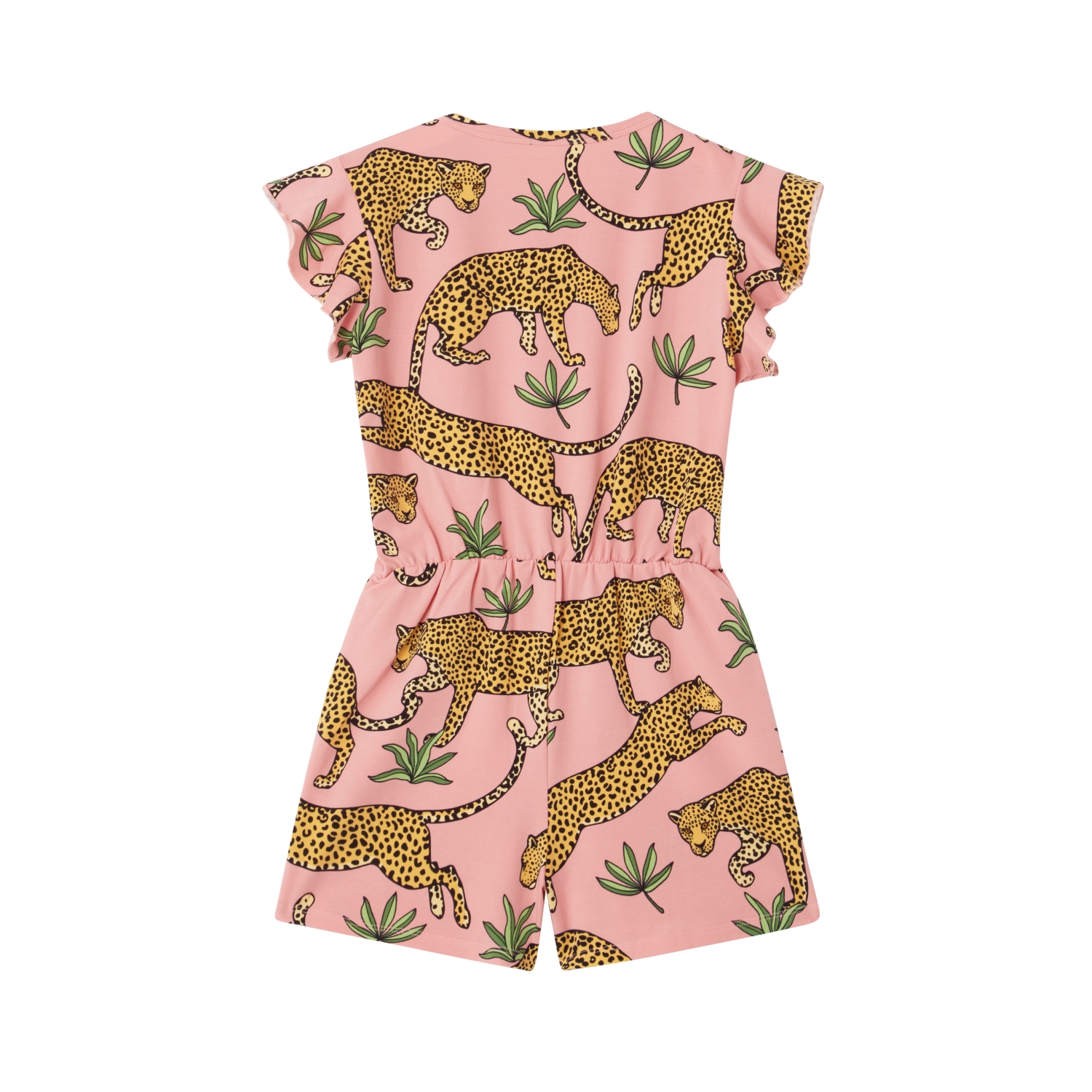 Short-sleeved playsuit in soft cotton jersey with an allover leopard print