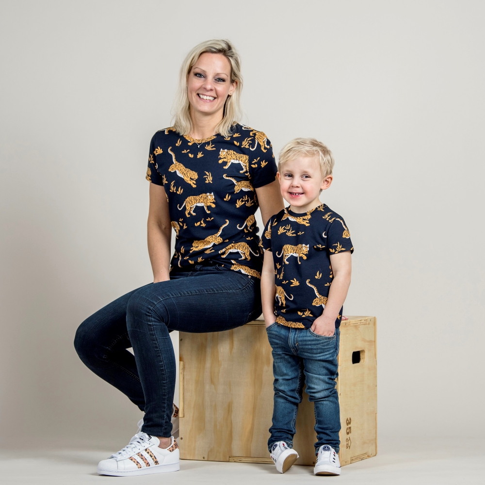 Short-sleeved navy T-shirt in soft organic cotton jersey with an allover tiger print