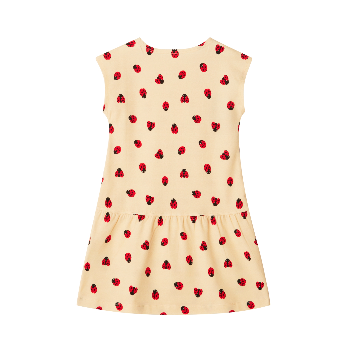 Ljusgul klänning i mjuk ekologisk bomullstrikå med tryck av nyckelpigor