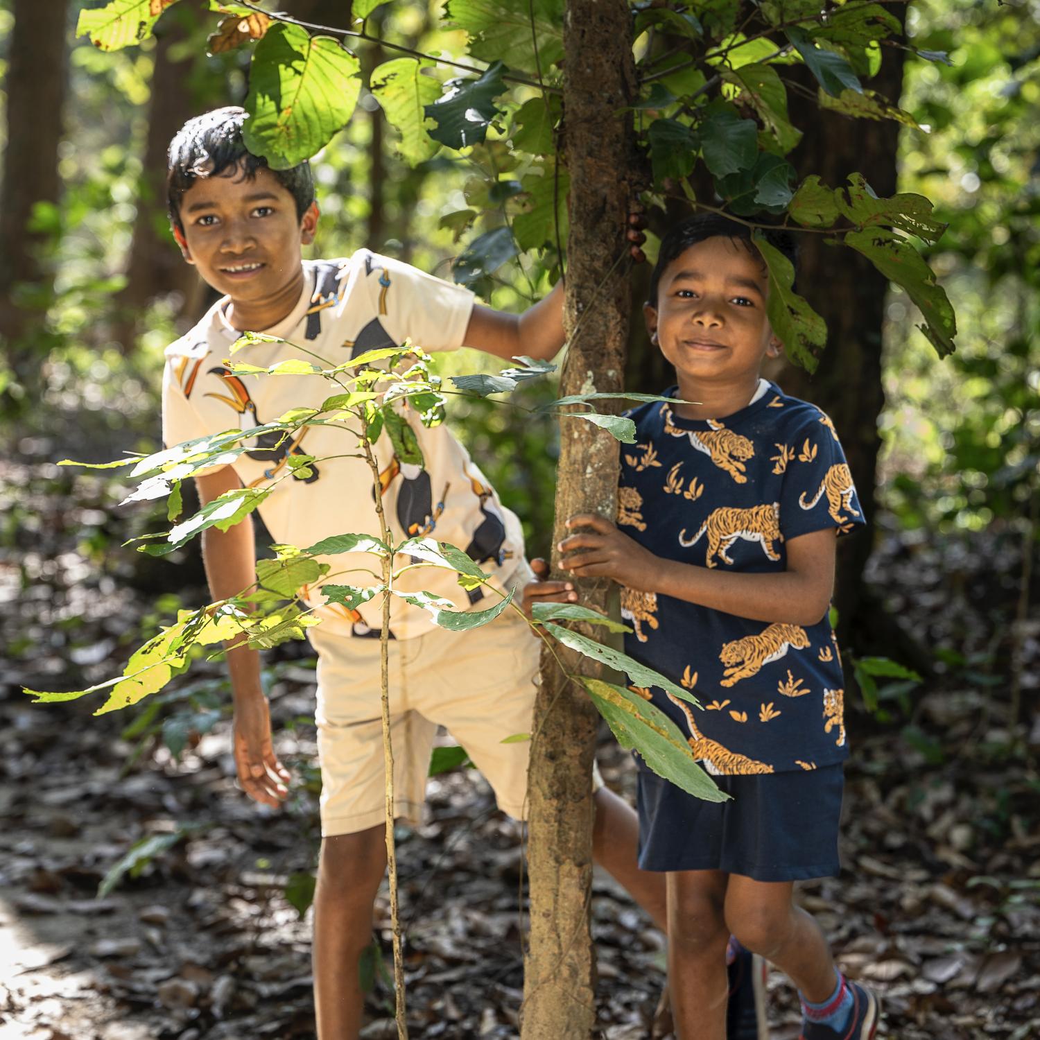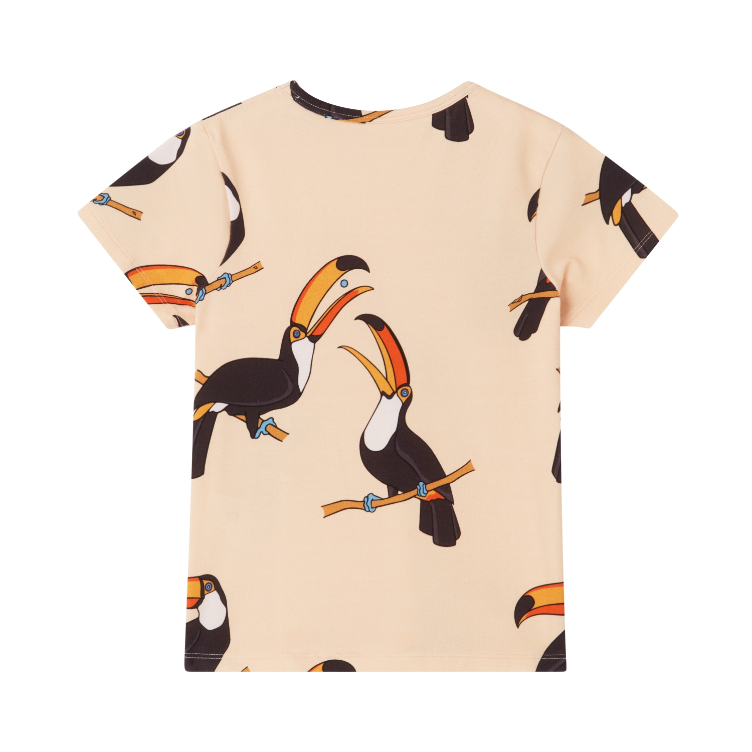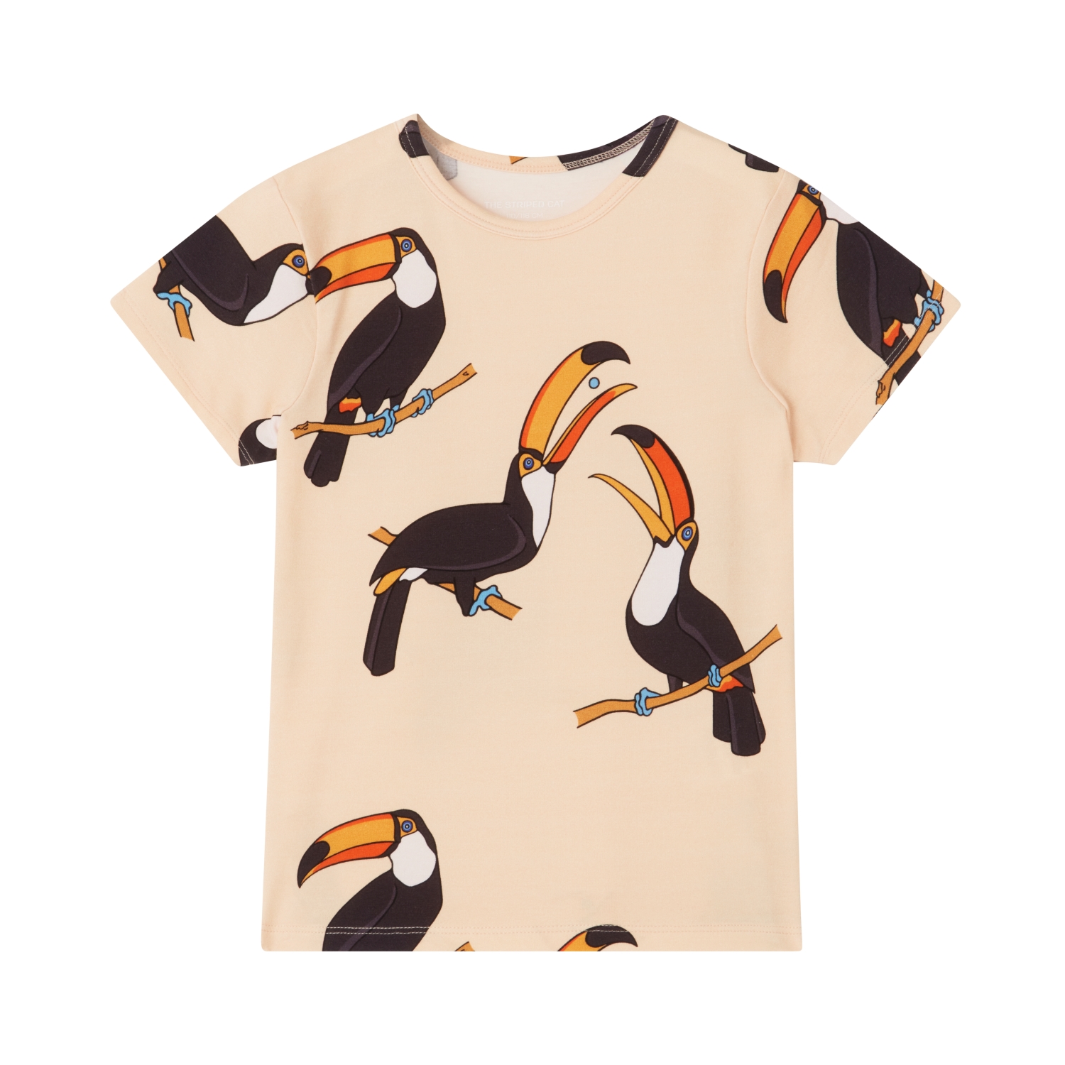 En kortärmad T-shirt i mjuk ekologisk bomullstrikå med tryck av toucaner